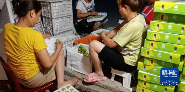 6月17日,林家有李种植养殖专业合作社工作人员连夜对蜂糖李进行分选打包。新华社记者齐健 摄