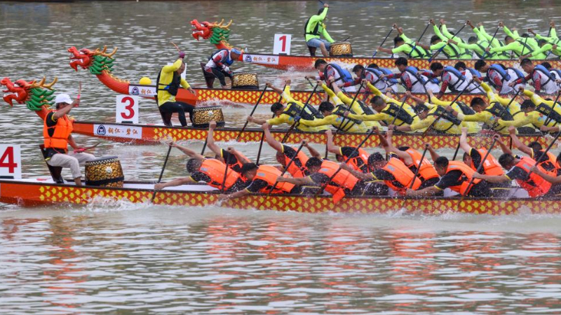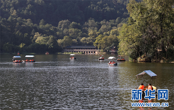 游客泛舟黔灵湖。新华网发(郭然 摄)