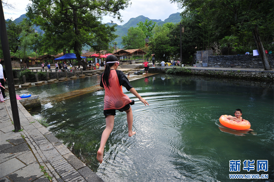 7月5日,两名小孩在梵净山下江口县的一处村落的河中嬉水。新华网 黄勇摄