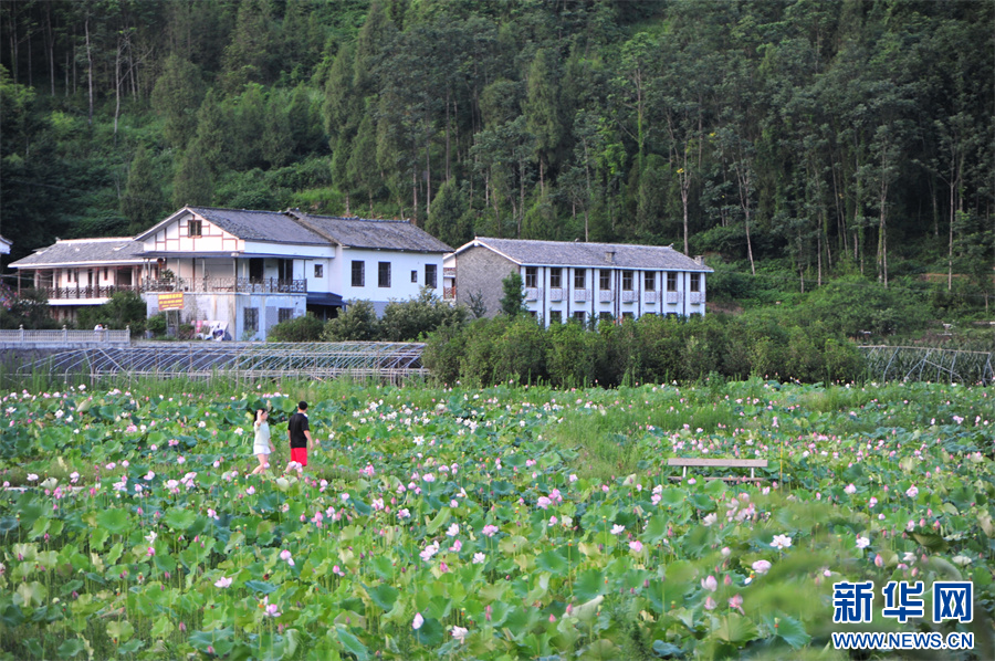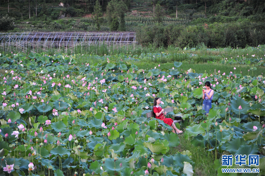 7月5日傍晚,游客在梵净山下江口县的一处荷塘游玩。新华网 黄勇摄