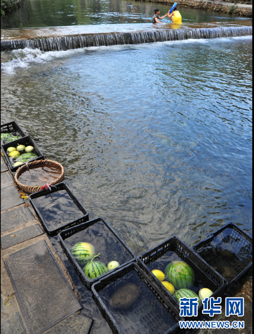 7月5日,梵净山下江口县的一处村落,清凉的河水成为村民“冰镇”瓜果的最佳选择。新华网 黄勇摄