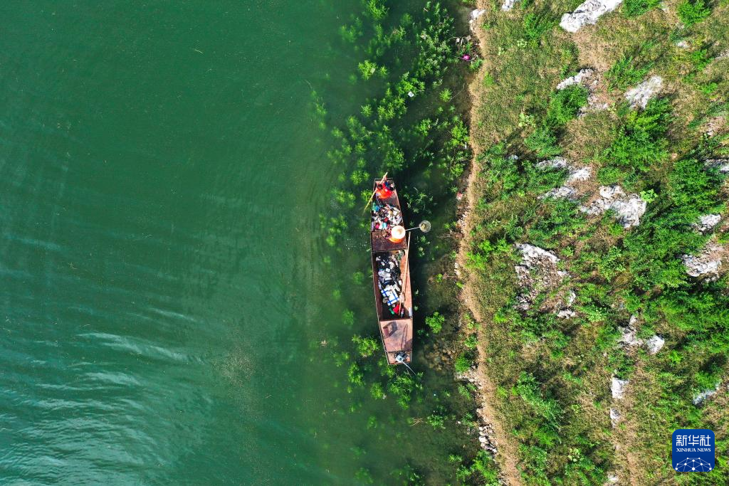 7月10日,卢锡永、冉茂英夫妇驾驶小船在乌江上打捞漂浮物(无人机照片)。
