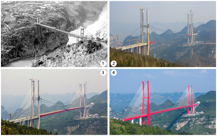 拼版照片:图1为修建于1934年的清镇至毕节公路上跨径为120米鸭池河吊桥,1958年7月1日建成通车,代表了20世纪50年代中国吊桥设计施工技术(翻拍照片);图2为在清毕路老鸭池河吊桥上游两公里的悬崖峭壁上,贵阳至黔西高速公路鸭池河特大桥于2013年8月开工,2014年底开始钢桁梁吊装(2016年1月5日摄);图3为贵阳至黔西高速公路鸭池河特大桥钢桁梁吊装合龙(2016年5月6日摄);图4为贵阳至黔西高速公路鸭池河特大桥于2016年7月底建成通车(2016年9月11日摄)。新华网发(聂宗荣 摄)