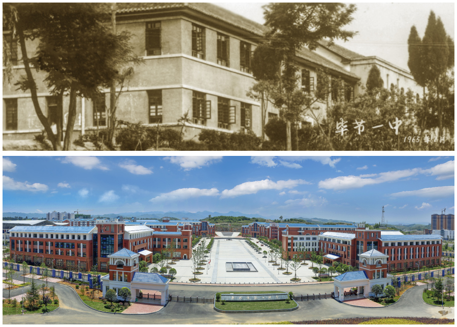 拼版照片:上图为1965年7月拍摄的毕节一中(聂宗荣 供图);下图为毕节一中金海湖校区全貌。新华网发(聂宗荣 摄)