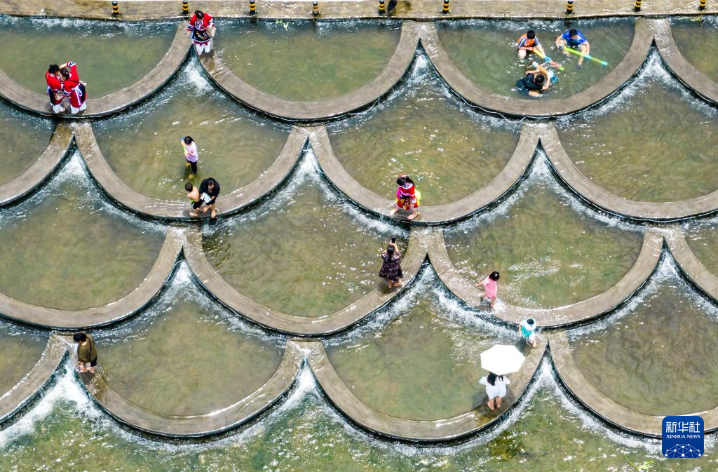 7月23日,游客在贵州省安顺经济技术开发区十里荷廊景区戏水(无人机照片)。新华社发(陈熙 摄)