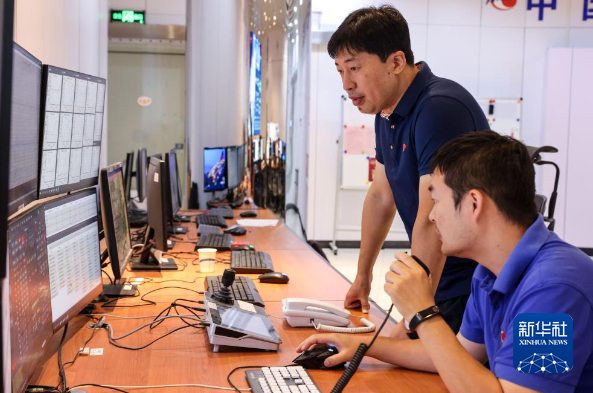 2022年8月25日,FAST运行和发展中心常务副主任、总工程师姜鹏(后)在“中国天眼”的总控室内与工作人员交谈(维护保养期间拍摄)。新华社记者 欧东衢 摄