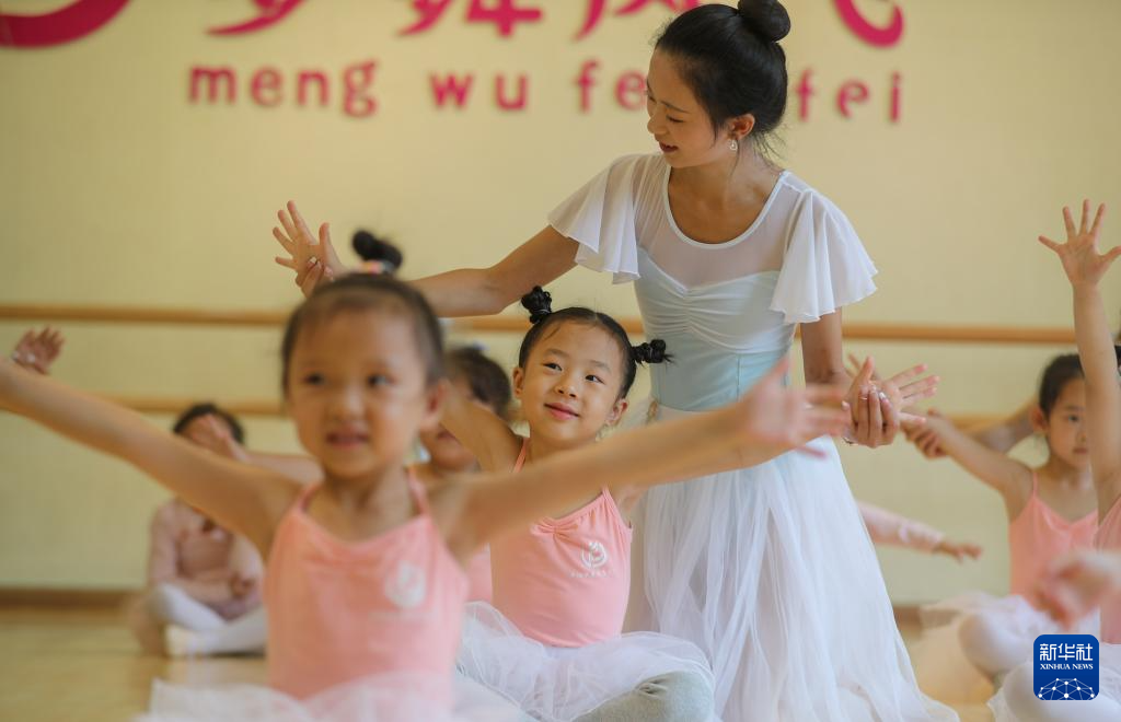 7月26日,在贵州省开阳县一家舞蹈艺术培训中心,孩子们在老师的指导下练习舞蹈基本动作。