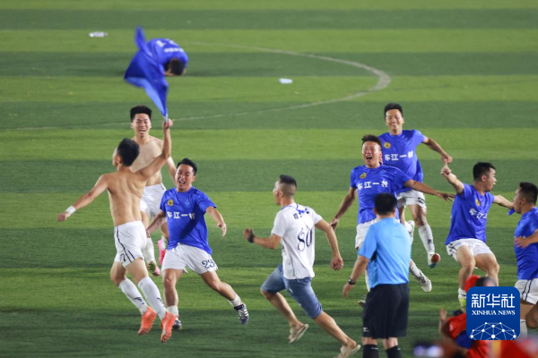 7月29日,获得冠军的车江一村队球员在夺冠后庆祝。新华社记者 刘续 摄