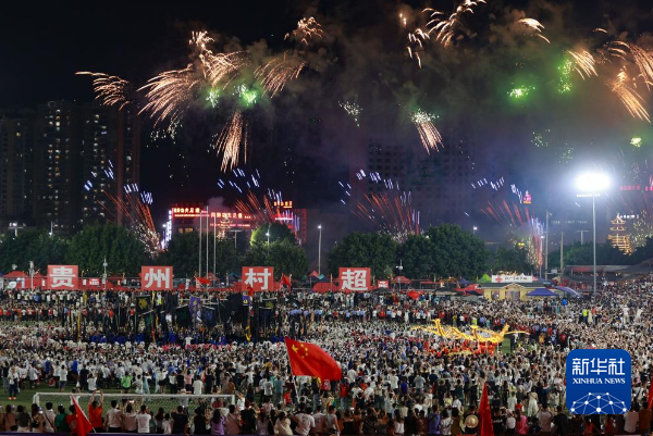 这是7月29日拍摄的“村超”比赛结束后的焰火表演。新华社记者 刘续 摄