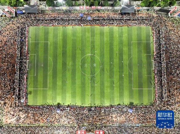 当天,距离比赛开球还有5个小时,球场内已是人山人海。开赛后,每当球员踢出一记好球,数万观众山呼海啸,还有啦啦队员敲击的锣鼓声和锅盆声,彰显乡村赛事的独特魅力。