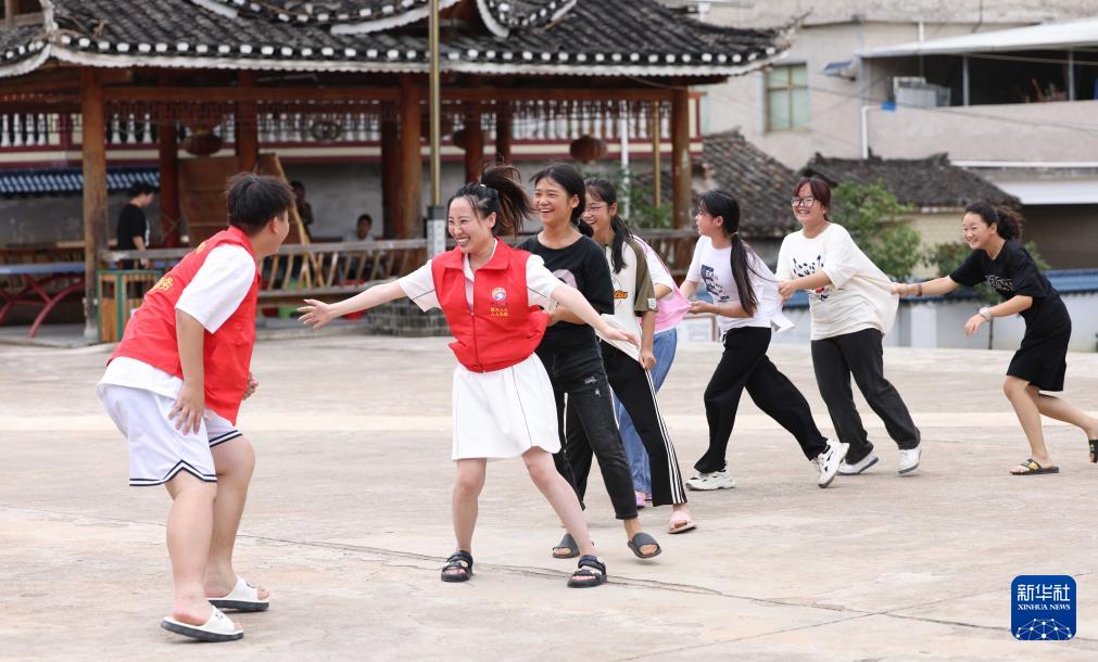 7月30日,大学生志愿者在贵州省黔东南苗族侗族自治州岑巩县水尾镇马家寨村和学生做游戏。暑期,来自贵州师范大学、天津师范大学、宁夏大学等10所大学的学生组成联合支教志愿者队伍,深入贵州省黔东南苗族侗族自治州岑巩县多个行政村,帮助暑期回家的学生开展体育活动,解决学习中遇到的难题,为他们的暑期生活增色添彩。