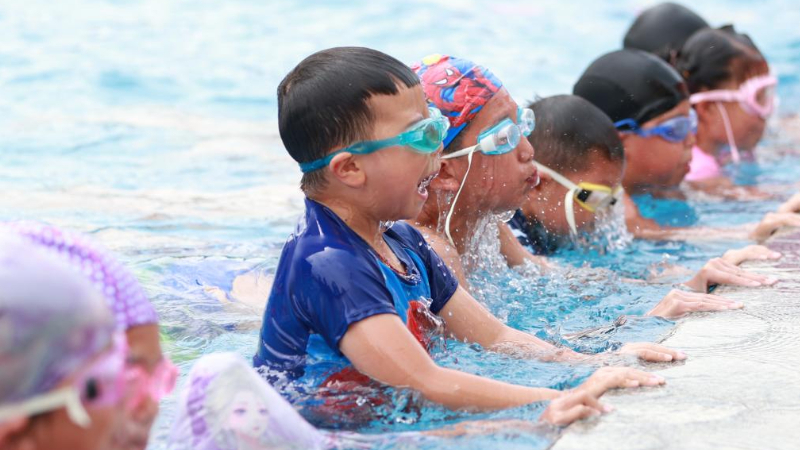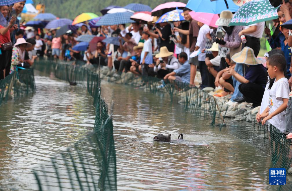7月30日,在贵州省从江县刚边壮族乡香猪趣味运动会上,人们在观看香猪游泳比赛。新华社发(罗京来 摄)