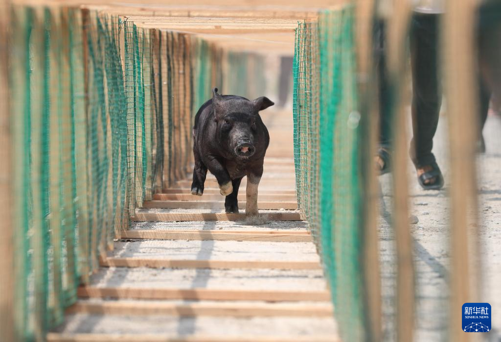 7月30日,在贵州省从江县刚边壮族乡香猪趣味运动会上,一头香猪在进行跑步比赛。新华社发(罗京来 摄)