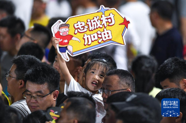7月29日,一名小朋友在“村超”比赛现场为忠诚村球队加油。新华社记者 杨文斌 摄
