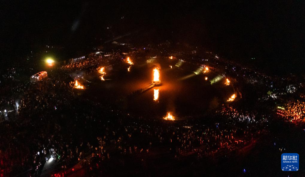 这是威宁彝族回族苗族自治县板底乡的篝火晚会现场(8月10日摄,无人机照片)。新华社记者 陶亮 摄