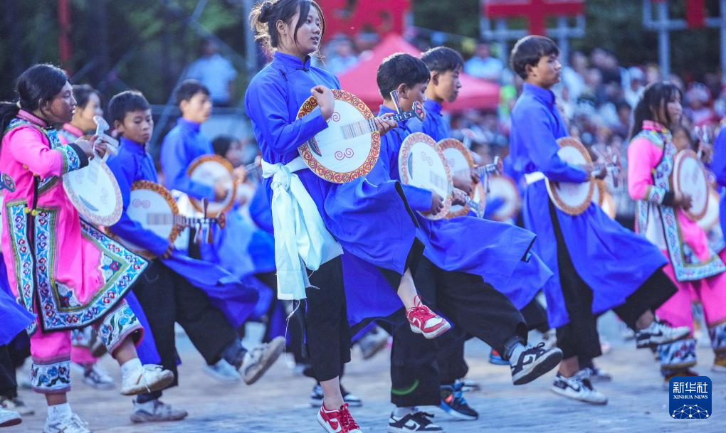 小朋友在威宁彝族回族苗族自治县火把节活动上表演月琴舞(8月10日摄)。新华社记者 陶亮 摄