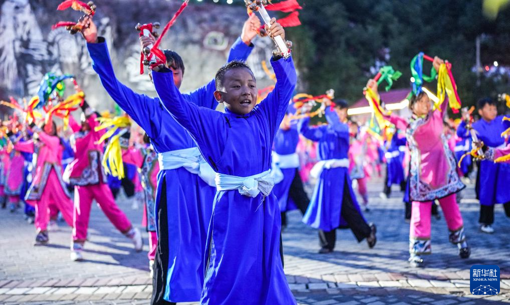 小朋友在威宁彝族回族苗族自治县火把节活动上表演铃铛舞(8月10日摄)。新华社记者 陶亮 摄