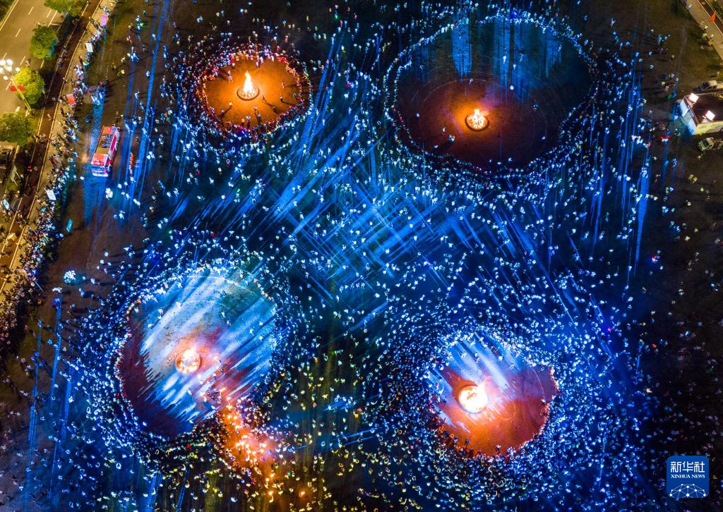 8月10日晚,群众在贵州省毕节市百里杜鹃管理区鹏程街道花瓣桥广场进行篝火狂欢(无人机照片)。新华社发(李华 摄)