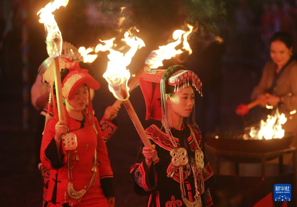 8月10日晚,演员在贵州省毕节市百里杜鹃管理区鹏程街道花瓣桥广场彝族火把节活动中表演节目。新华社发(李华 摄)