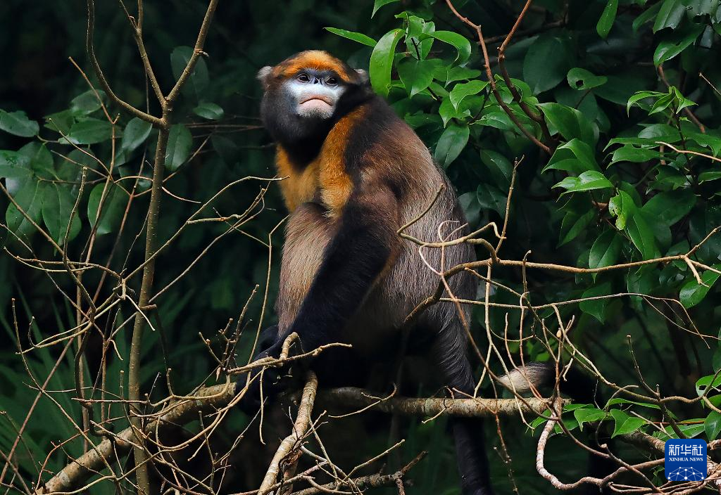 一只黔金丝猴在梵净山密林中休憩(2022年11月19日摄)。新华社记者 杨楹 摄