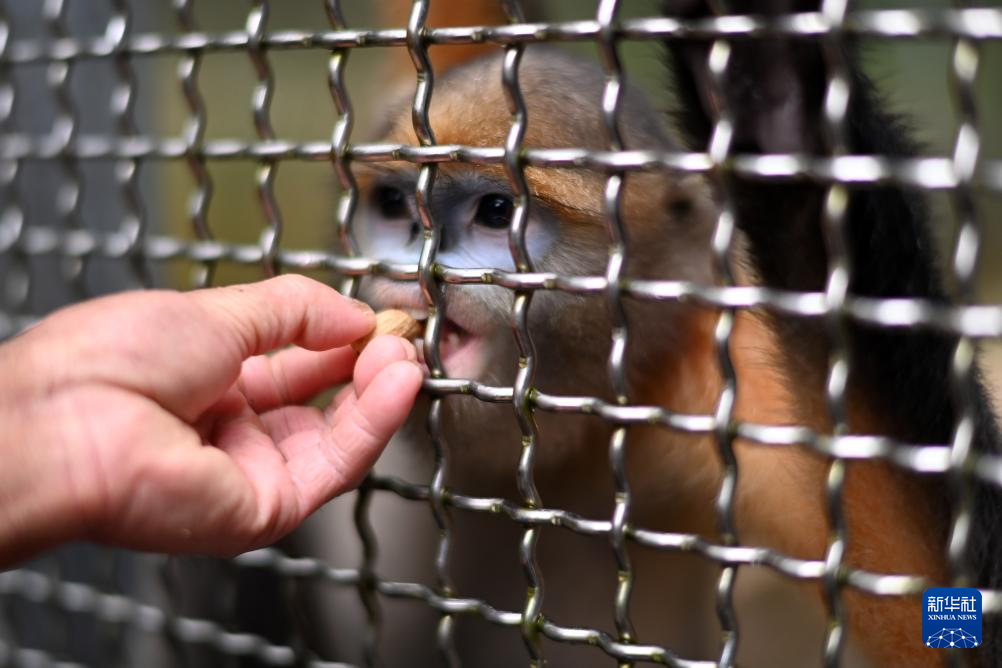 8月14日,在梵净山野生动物救护中心,工作人员给一只黔金丝猴喂食。新华社记者 杨楹 摄