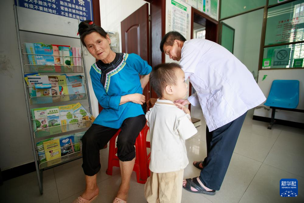 村医项昌会在榕江县忠诚镇盘踅村为村里的小朋友进行体检(8月16日摄)。新华社记者 刘续 摄
