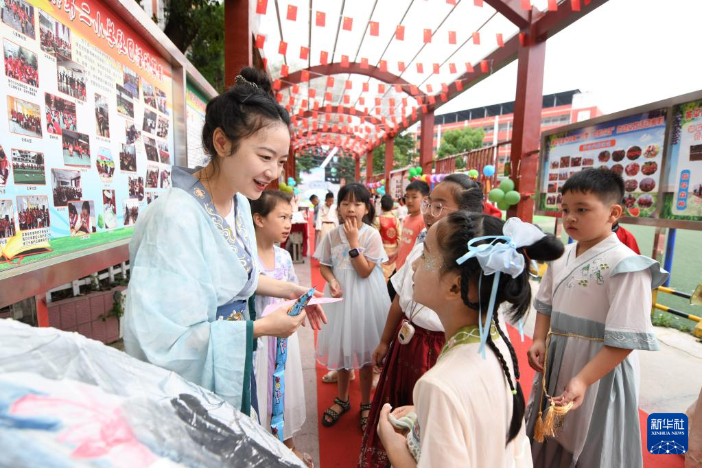 8月21日,贵州省都匀市第二完全小学高年级的同学带领一年级新生参观校园。新华社发(肖伟 摄)