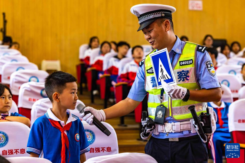8月21日,交警在贵州省安顺市西秀区启新学校为学生讲解交通安全知识。新华社发(陈熙 摄)