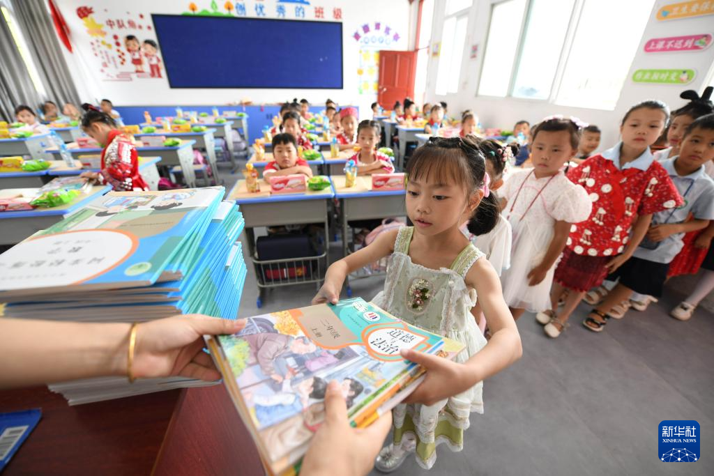8月21日,学生在贵州省黔东南苗族侗族自治州黄平县新州镇中心小学领取新课本。新华社发(王超 摄)