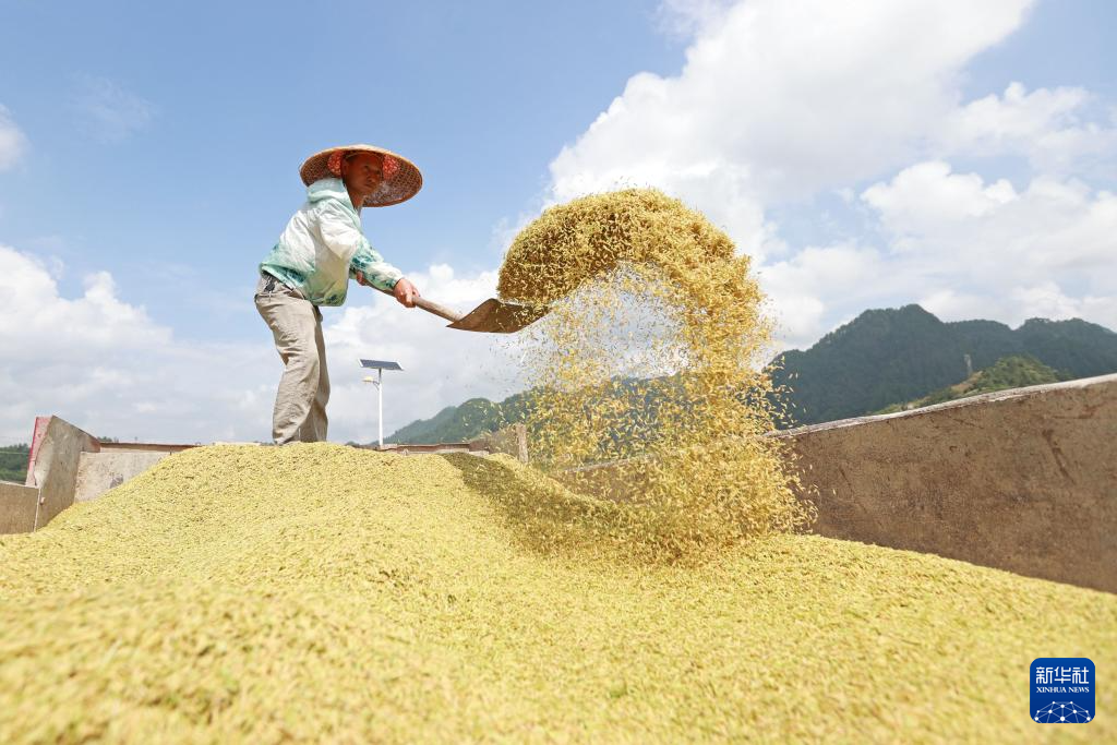 8月23日,农民在贵州省黔东南苗族侗族自治州岑巩县注溪镇周坪村杂交水稻制种基地将收割的水稻装车。新华社发(唐鹏 摄)