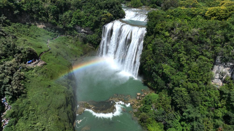 8月23日,农民在贵州省安顺市西秀区旧州镇浪塘村田间劳作(无人机照片)。
