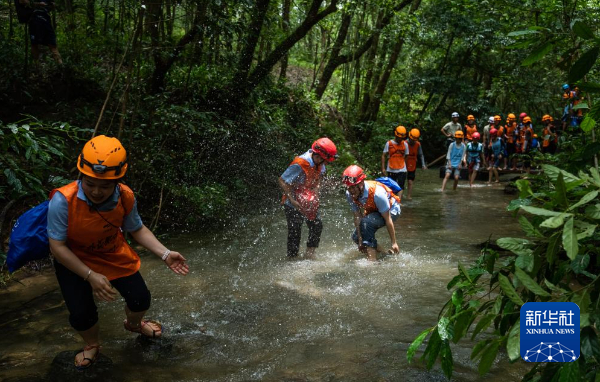 8月22日,游客在贵州省黔南布依族苗族自治州荔波县小七孔景区体验踏步戏水项目。(受访者供图)