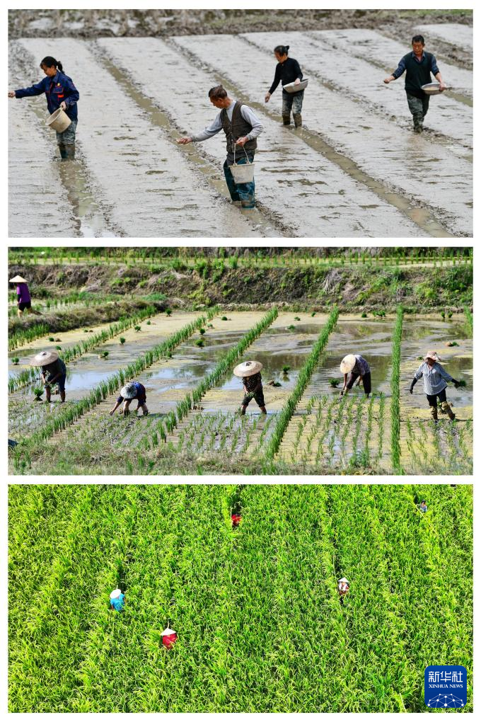拼版照片:上图为村民在陈良东的水稻制种基地里播种(4月7日摄);中图为村民在陈良东的水稻制种基地里插秧(5月29日摄);下图为村民在陈良东的水稻制种基地里“赶花”授粉(8月1日摄,无人机照片)。新华社记者 杨文斌 摄