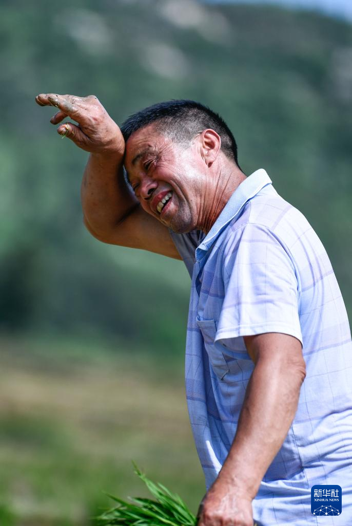陈良东在水稻制种基地里插秧时擦汗水(5月29日摄)。新华社记者 杨文斌 摄