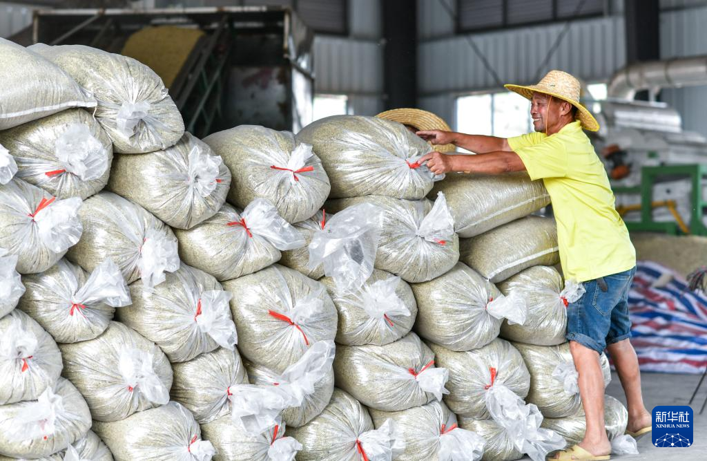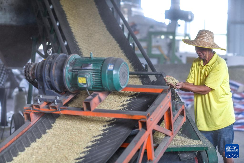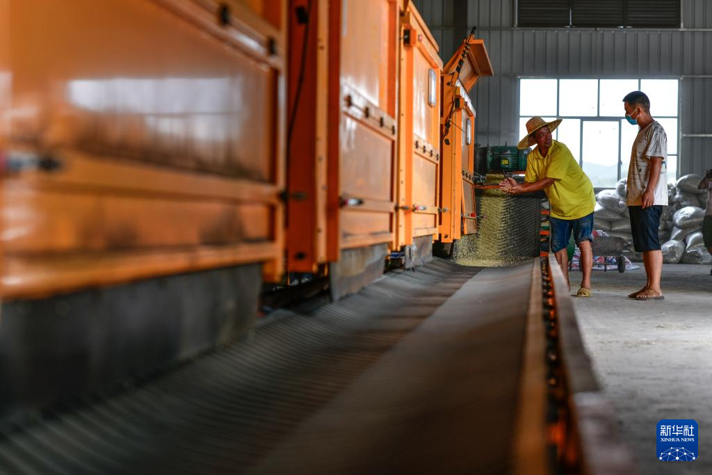陈良东在种子加工车间查看今年收获的稻种烘干情况(8月26日摄)。新华社记者 杨文斌 摄