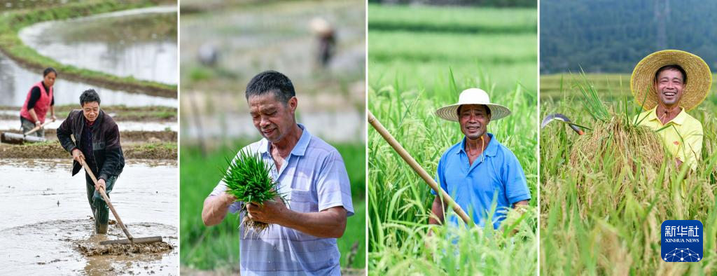 拼版照片:从左至右为4月6日,为陈良东在水稻制种基地里平整田块,准备播种;5月29日,陈良东在移栽秧苗;8月1日,陈良东在水稻制种基地里拿着竹竿,准备给制种水稻“赶花”授粉;8月26日,陈良东展示收获的水稻种子。新华社记者 杨文斌 摄