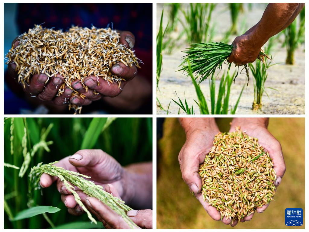 拼版照片:左上图为陈良东在展示发芽的稻种,准备播种(4月6日摄);右上图为陈良东在水稻制种基地里插秧(5月29日摄);左下图为陈良东在查看水稻授粉情况(8月1日摄);右下图为陈良东展示收获的水稻种子(8月26日摄)。新华社记者 杨文斌 摄