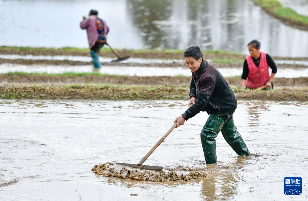 陈良东(前)与村民在水稻制种基地里平整田块,准备播种(4月6日摄)。