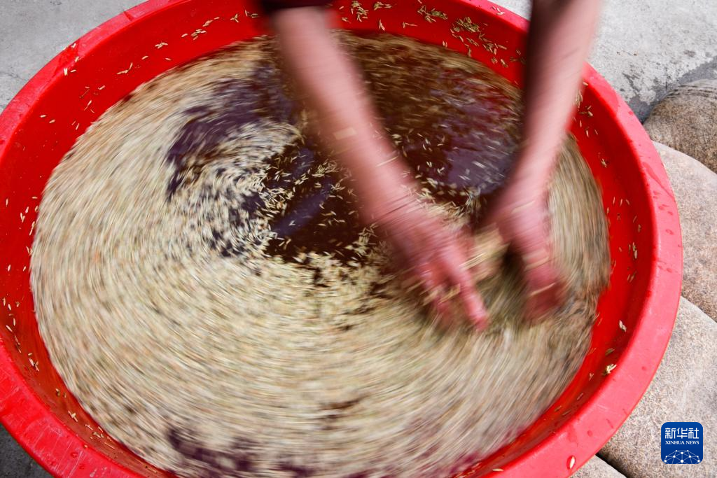 陈良东在浸泡稻种,为杂交水稻育苗做准备(4月6日摄)。新华社记者 杨文斌 摄
