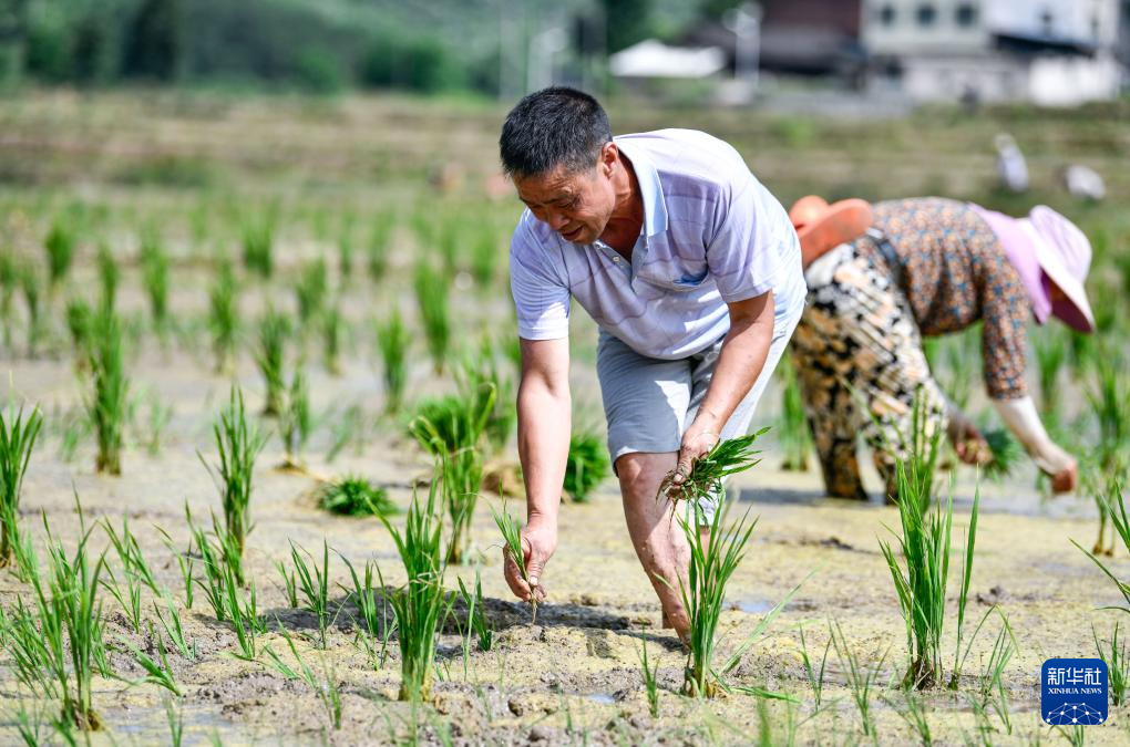 陈良东(前)与村民在水稻制种基地里插秧(5月29日摄)。新华社记者 杨文斌 摄