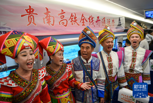 新华社贵阳8月31日电 在首发车G4308次列车停靠的站台上,壮乡百姓敲响铜鼓,演奏民俗歌曲,载歌载舞庆祝广西与贵州间首条时速350公里的高铁全线开通运营。进站的旅客们纷纷驻足欣赏,合影留念。