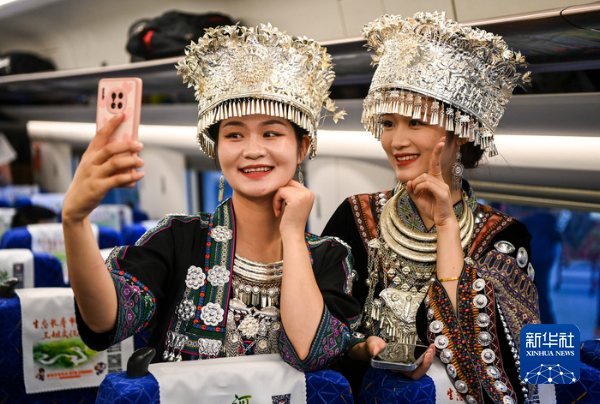 8月31日,身穿少数民族服装的乘客在由南宁东开往贵阳北的G4308次列车上合影留念。新华社记者 曹祎铭 摄