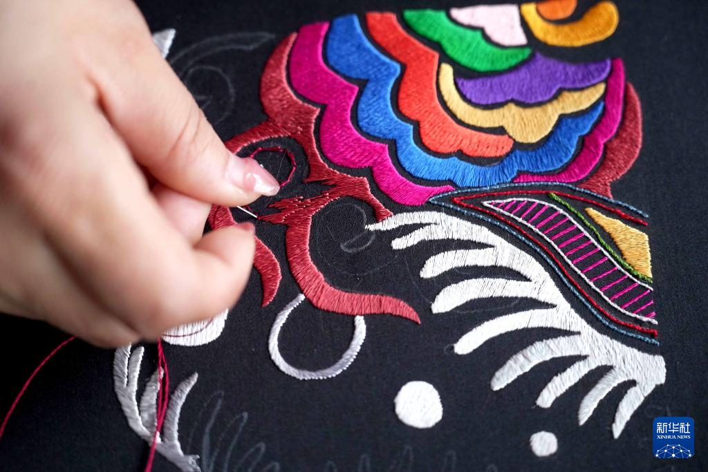 绣娘在贵州省黔东南苗族侗族自治州施秉县一家非遗企业苗绣生产车间赶制订单(8月25日摄)。新华社发(王炳真 摄)
