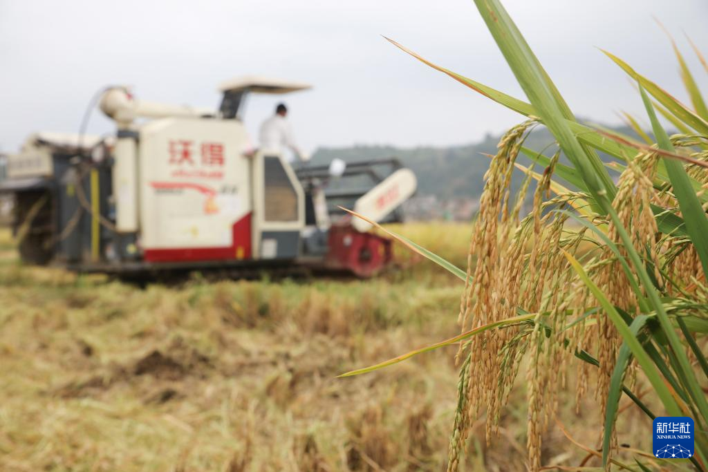 9月14日,村民在贵州省黔东南苗族侗族自治州施秉县城关镇上翁哨村驾驶收割机收割水稻。新华社发(磨桂宾 摄)