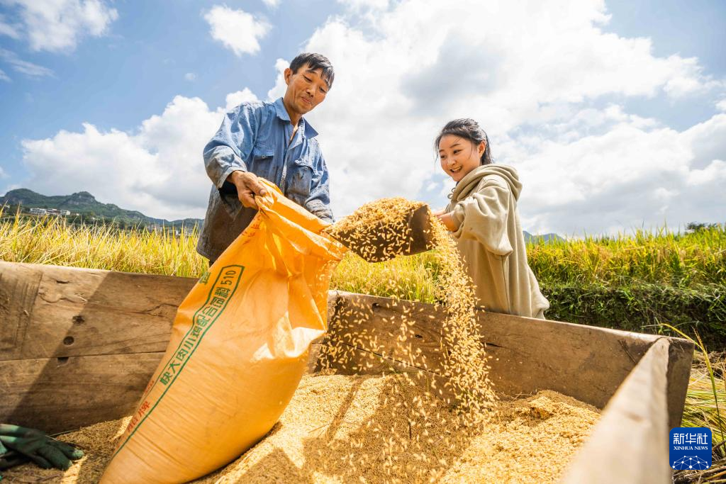 9月15日,村民在贵州省黔西市锦星镇洪湖村收割稻谷。新华社发(范晖 摄)