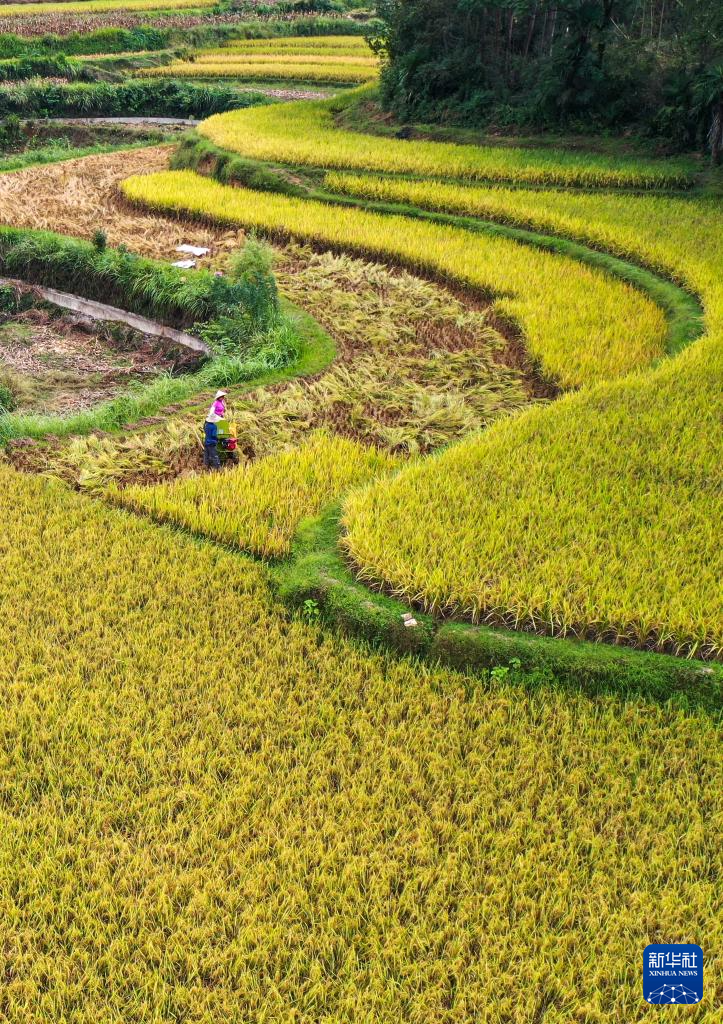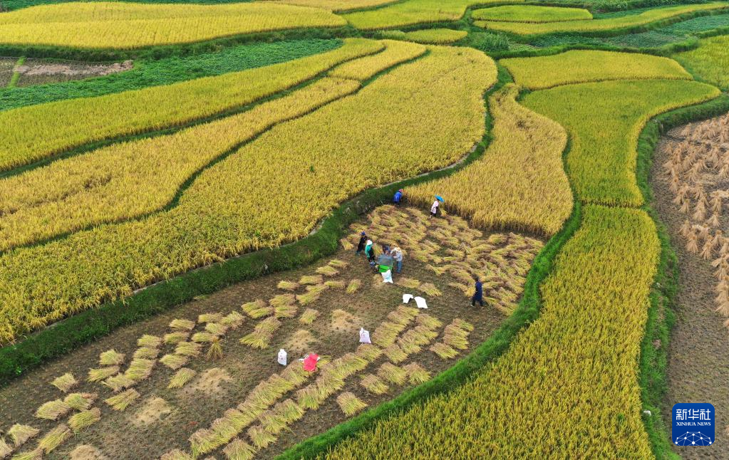 9月14日,贵州省黔东南苗族侗族自治州丹寨县扬武镇密告村村民在梯田间收获稻谷(无人机照片)。新华社发(黄晓海 摄)