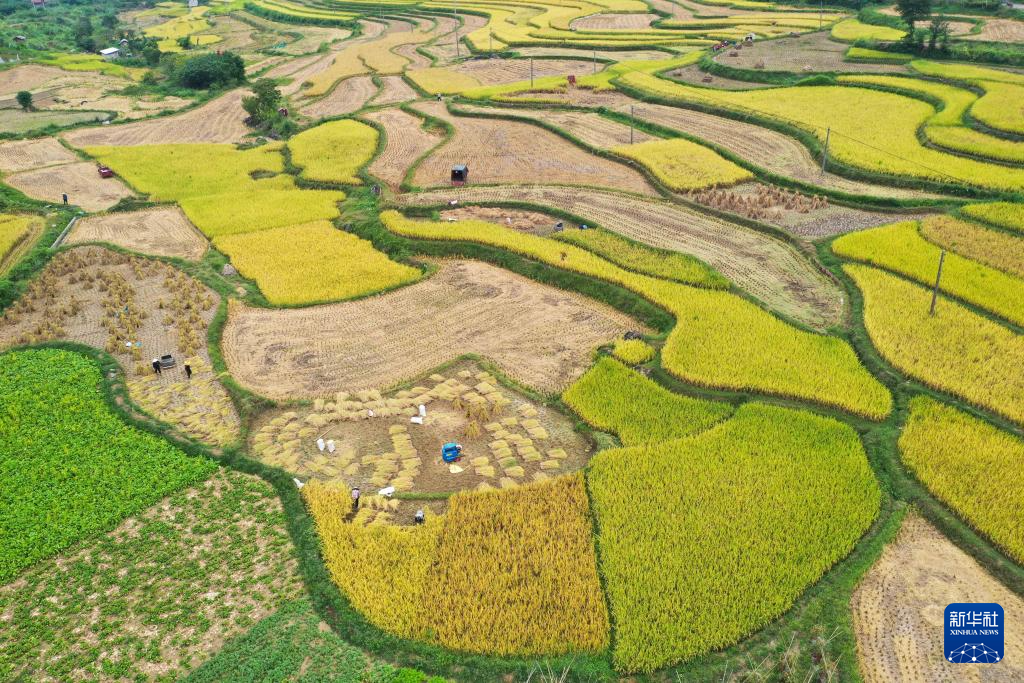 9月14日,村民在贵州省黔东南苗族侗族自治州岑巩县天星乡天星村收获水稻(无人机照片)。新华社发(胡攀学 摄)