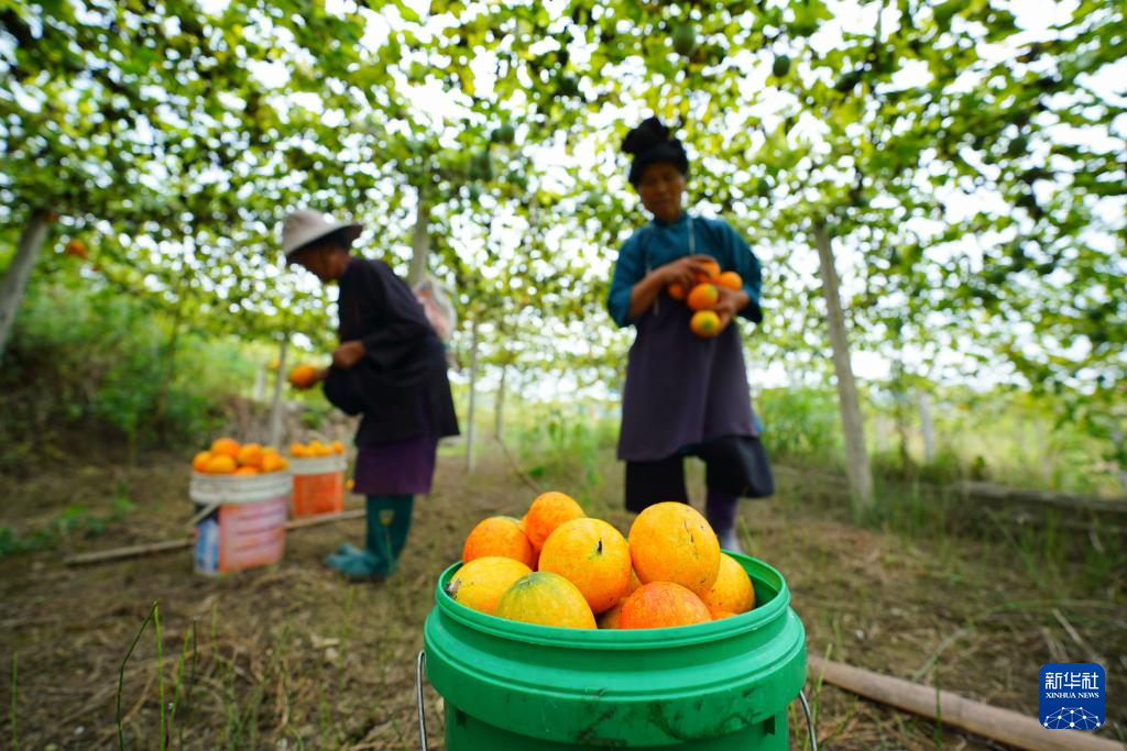 9月14日,村民在贵州省黔东南苗族侗族自治州丹寨县龙泉镇马寨村吊瓜种植基地采收吊瓜。新华社发(杨武魁 摄)