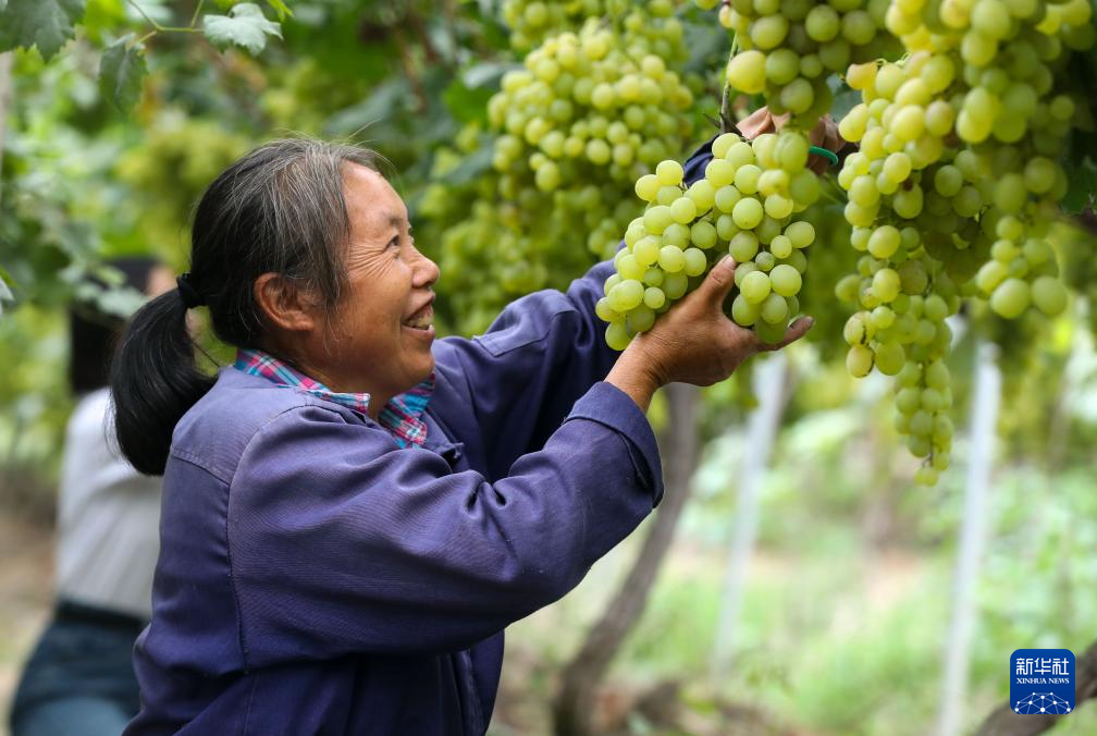9月14日,果农在贵州省开阳县南江乡龙广村水果种植基地采摘醉金香葡萄。新华社发(袁福洪 摄)