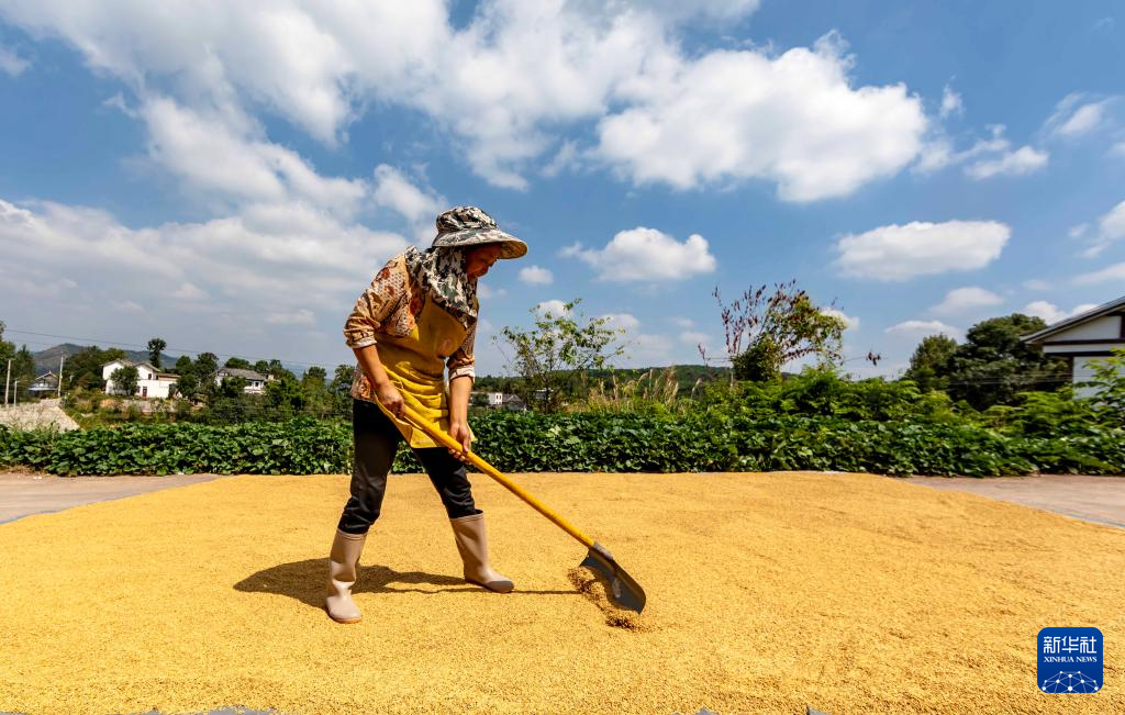 9月15日,村民在贵州省黔西市锦星镇洪湖村晾晒稻谷。新华社发(范晖 摄)